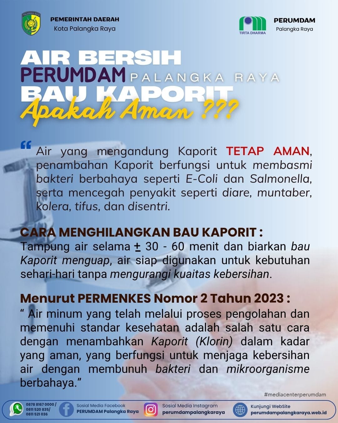 Bau kaporit pada air bersih PERUMDAM Palangka Raya bukan berarti air berbahaya, justru itu tanda bahwa air telah melalui proses Sterilisasi sesuai dengan PERMENKES Nomor 2 Tahun 2023.