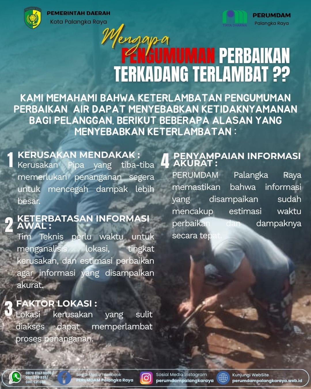 PERUMDAM Palangka Raya memahami bahwa keterlambatan pengumuman perbaikan air dapat menyebabkan ketidaknyamanan bagi pelanggan, berikut beberapa alasan yang menyebabkan keterlambatan.