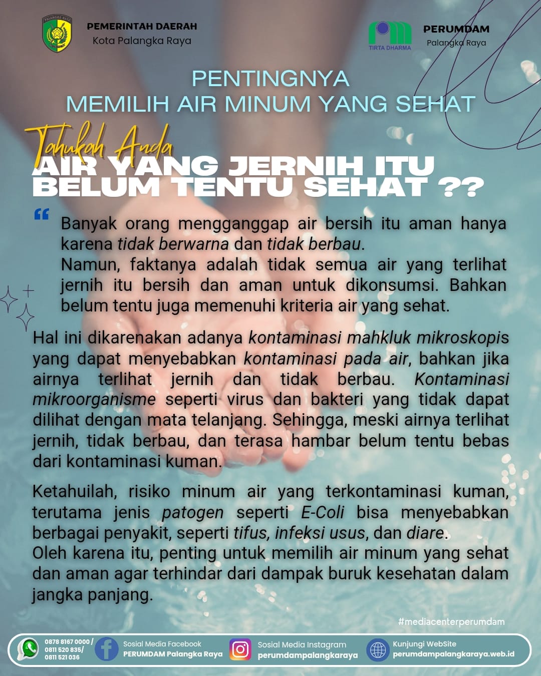 "Banyak orang mengganggap air bersih itu aman hanya karena tidak berwarna dan tidak berbau. Namun, faktanya adalah tidak semua air yang terlihat jernih itu bersih dan aman untuk dikonsumsi. Bahkan belum tentu juga memenuhi kriteria air yang sehat."